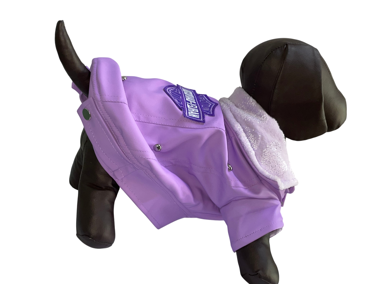 Chamarra Harley-Davidson morada para mascotas, con diseño resistente, detalles bordados y forro suave. Perfecta para proteger del frío con estilo único.
