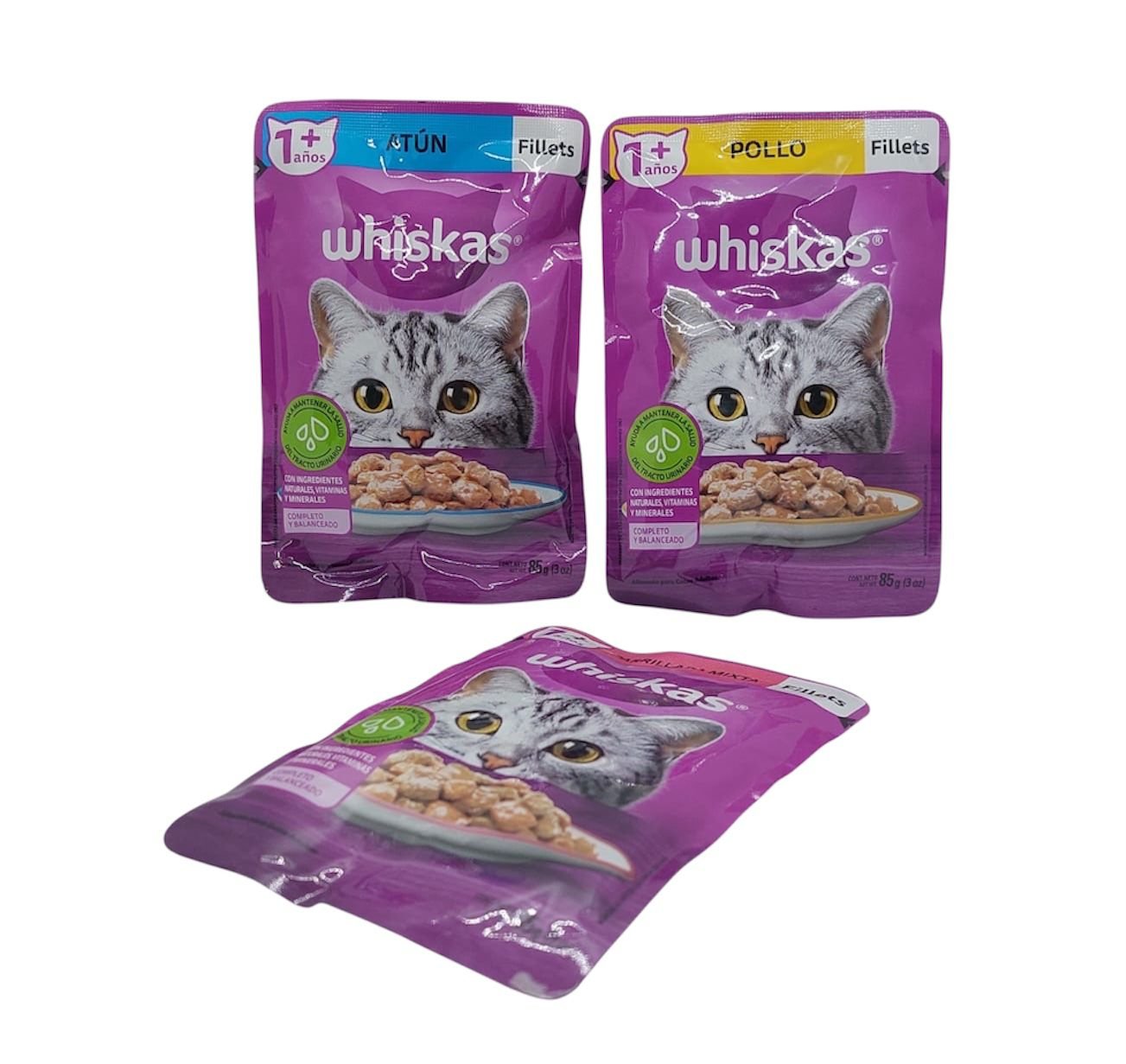 Whiskas Fillets, deliciosas recetas húmedas para gatos mayores de 1 año, con ingredientes naturales, vitaminas y minerales para una nutrición equilibrada.