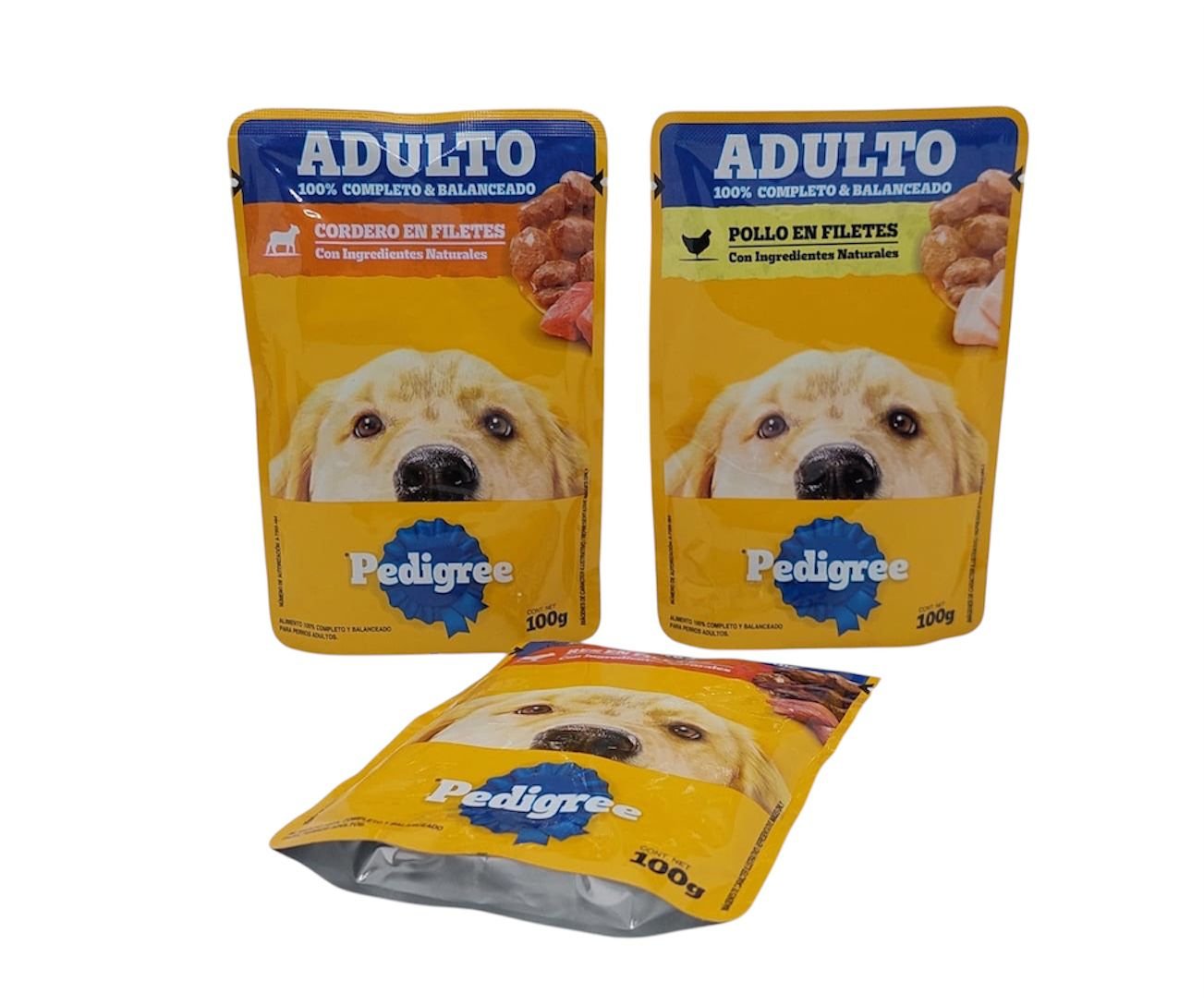 Pedigree Alimento Húmedo para perros adultos 100% completo y Balanceado. El alimento húmedo Pedigree para perros adultos está formulado para ofrecer una nutrición completa y equilibrada, con ingredientes naturales y deliciosos sabores como cordero en filetes y pollo en filetes . Diseñado para complementar la dieta de tu mascota, es una opción saludable y apetitosa que aporta proteínas esenciales, vitaminas y minerales para mantener su vitalidad y salud. Ideal como comida principal o mezclada con croquetas para una experiencia más sabrosa.