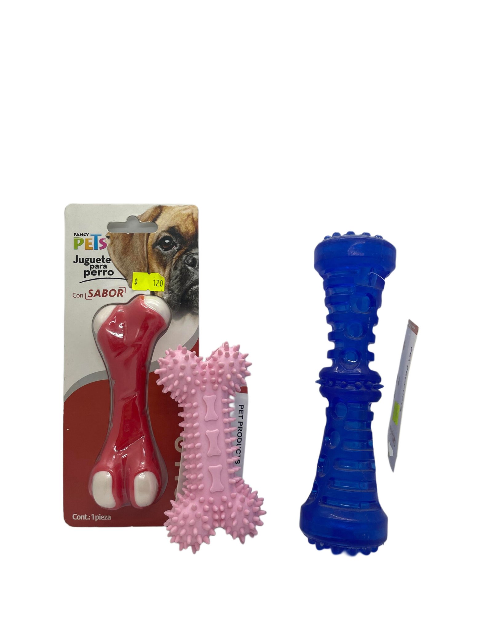 Juguetes en forma de hueso, fabricados con materiales resistentes para soportar mordidas intensas. Ideales para mantener a tu mascota entretenida mientras cuida su salud dental.
