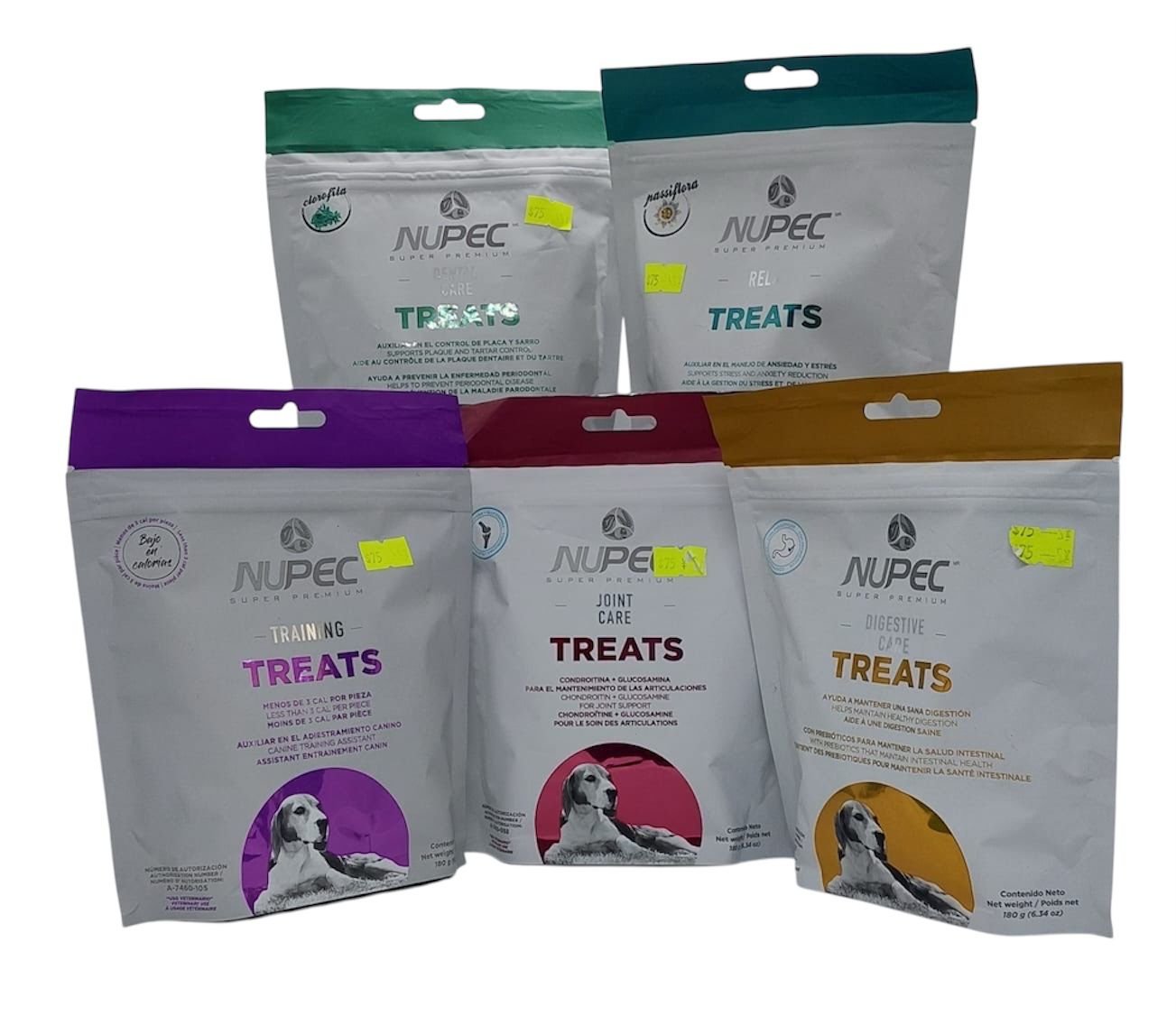 Estos NUPEC Super Premium Treats , una línea de premios funcionales para perros que ofrece beneficios específicos según sus necesidades: cuidado dental, relajación, entrenamiento, cuidado articular y digestión. Cada variedad está formulada con ingredientes especializados para promover la salud y el bienestar de tu mascota. Perfecto como recompensa y complemento en su dieta diaria.